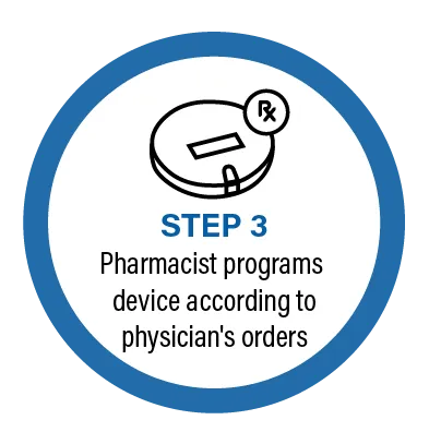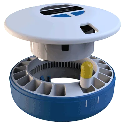 Using our patent pending technology, this electronically controlled device ensures that patients take their medication as prescribed. The device features two pill trays that accommodate different-sized medications and holds up to 30 pills in total. The pharmacist fills the device, which automatically dispenses the prescribed dosage at the time and in the amount prescribed and then locks once the prescription expires. This simple yet effective solution helps ensure only one dosage can be accessed at the designated time.